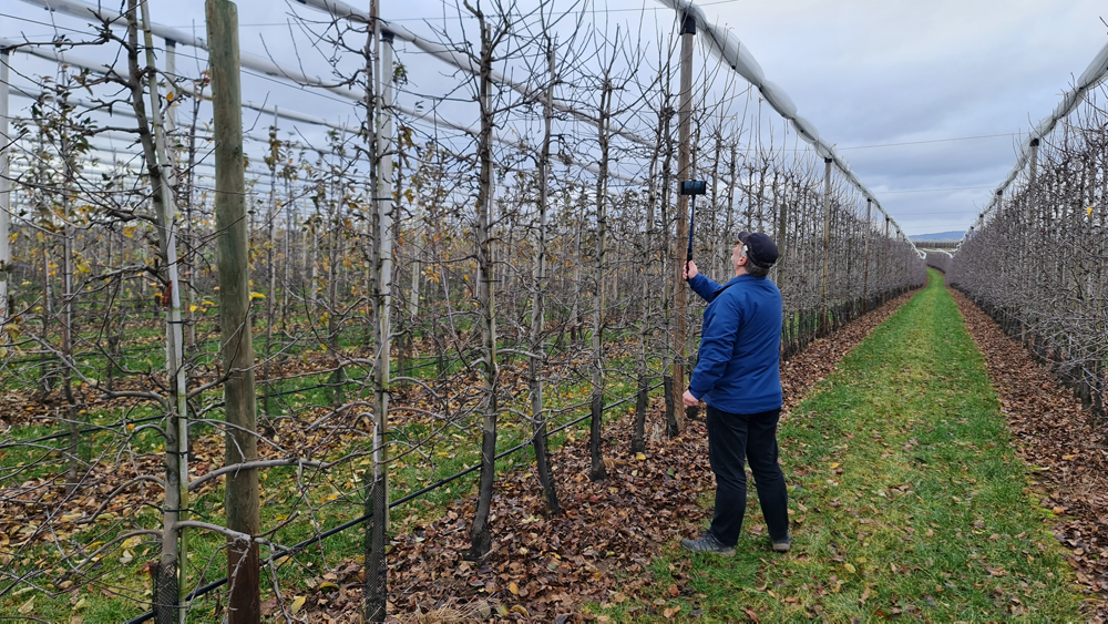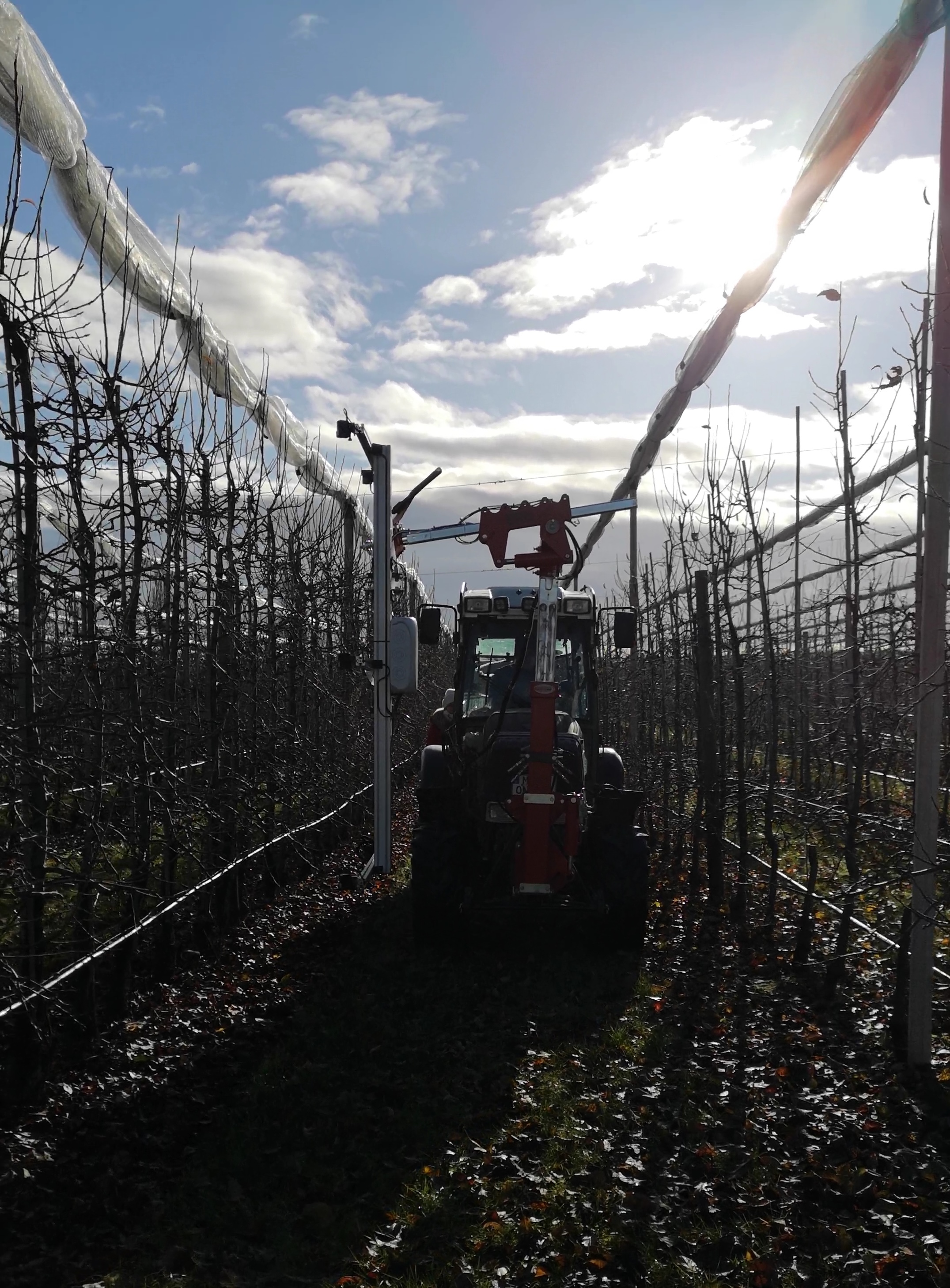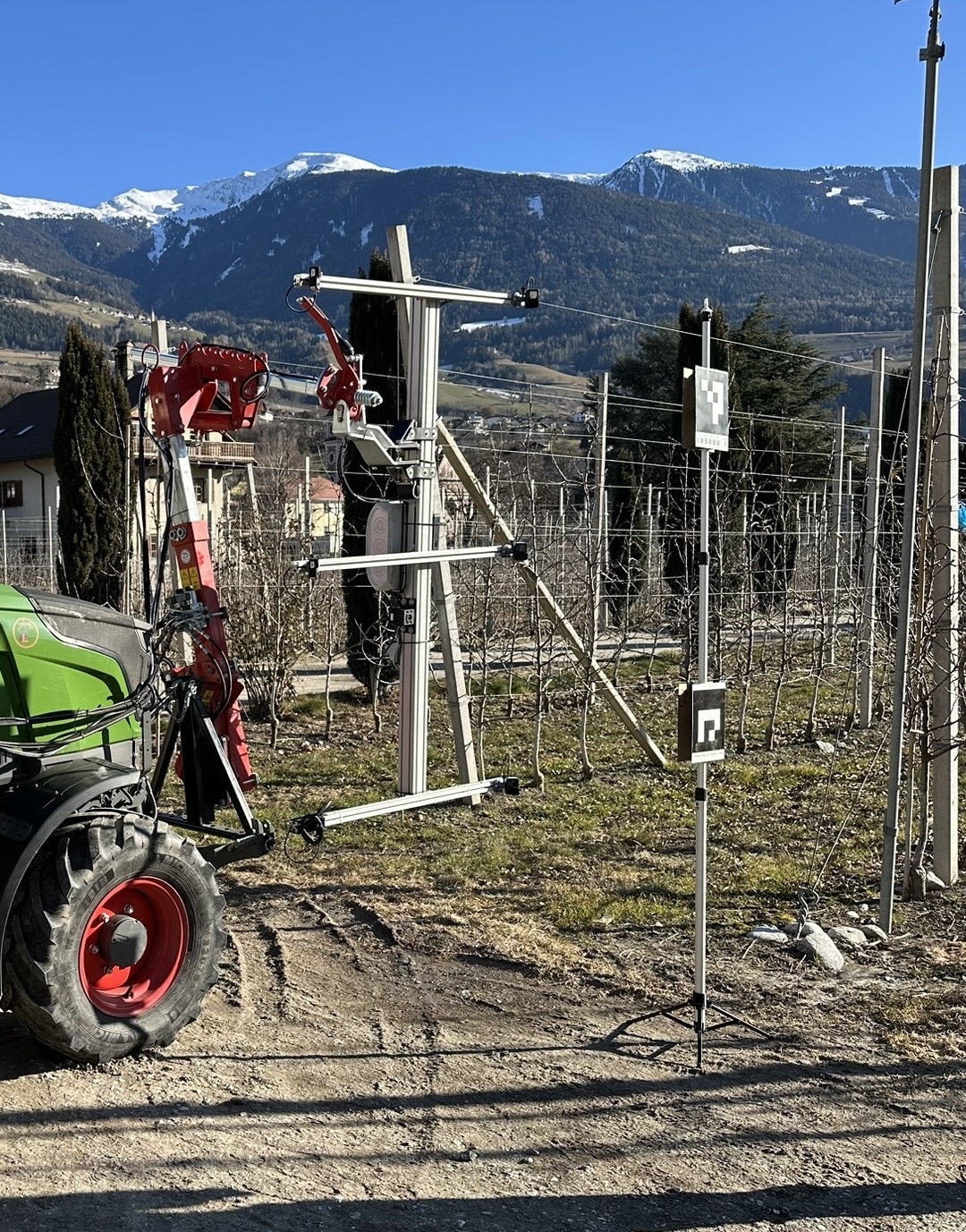 Im Laufe der Schnittsaison waren Mitarbeiterinnen des Versuchszenturms Laimburg damit beschäftigt, Videos von Apfelbäumen in Ertragsanlagen zu erstellen. In Anlagen des VZ in Pfatten und Auer und bei den Partnerbetrieben in Sigumndskron und Brixen wurden insgesamt knapp 1.600 Videos aufgezeichnet. Mit etwa 10 Tagen war diese Arbeit recht zeitintensiv. Die gewonnenen Daten wurden im weiteren Jahresverlauf weiter verarbeitet. Um das Problem der zeitaufwändigen Videoaufnahme zu lösen, wurde im Jahresverlauf 2024 ein Kameragestell entwickelt, das sich zur Massenaufnahme von Anlagen eignet. Es lässt sich am Traktor montieren und verfügt über 6 Actionkameras, die in verschiedenen Höhen befestigt sind. Später müssen diese 6 Perspektiven bei der 3D-Modellbildung wieder zusammengesetzt werden.
