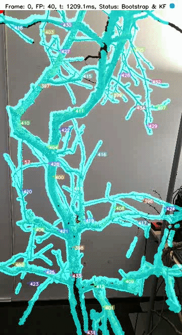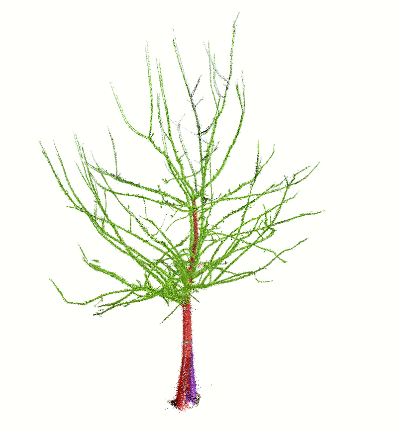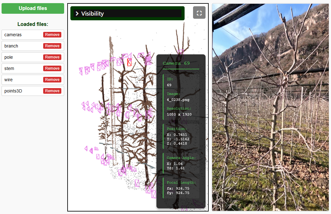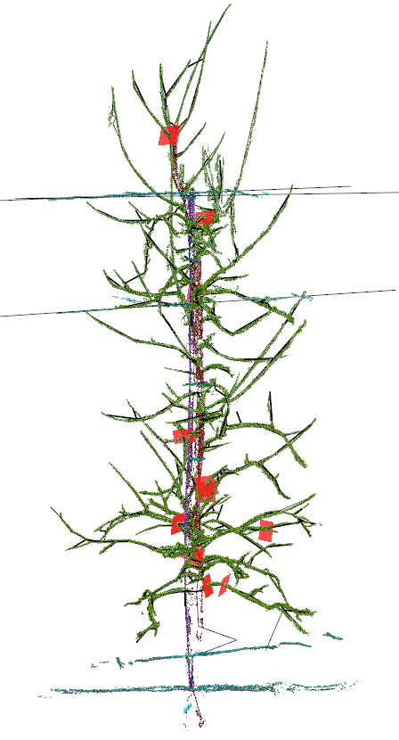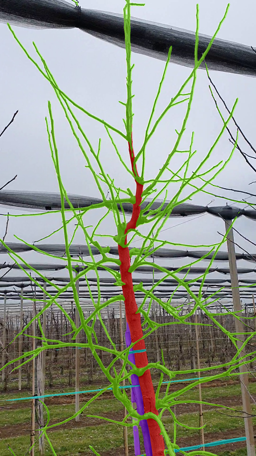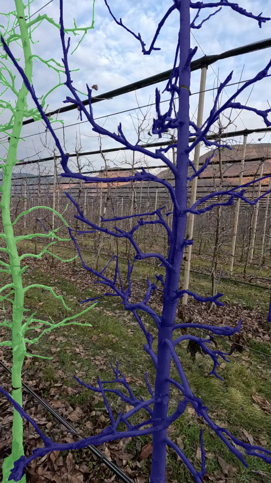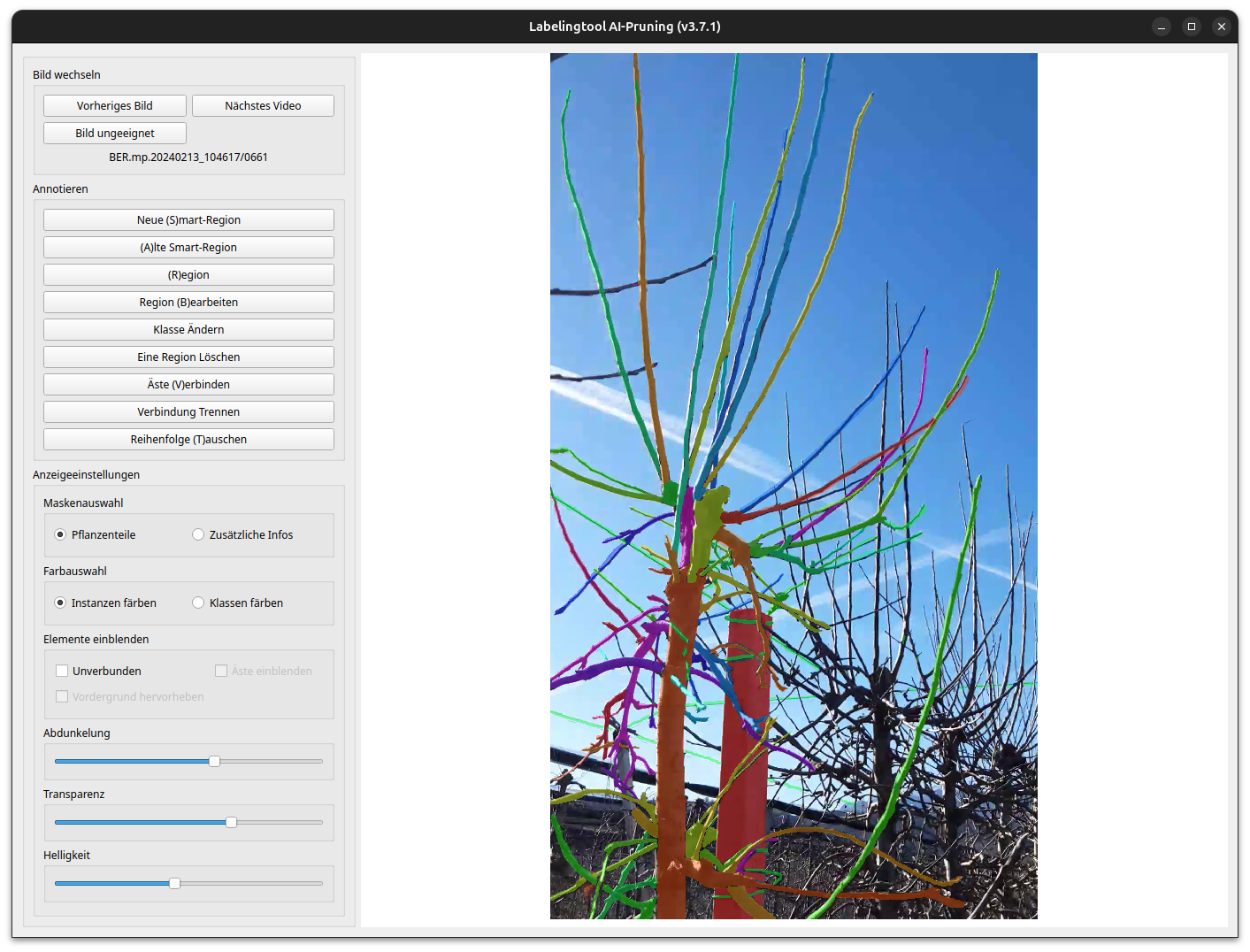 Die aufgenommenen Bilder der Apfelbäume in Ertragsanlagen werden einzeln von Hand bearbeitet. Dabei wird jede Region des Baumes (Stamm, Ast und Blätter) gekennzeichnet und anschließend miteinander verbunden. Auch andere relevante Objekte, z.B. Drähte und Pfosten müssen erfasst werden, um die Voraussetzung für eine anschließende 3D Modellierung zu schaffen.